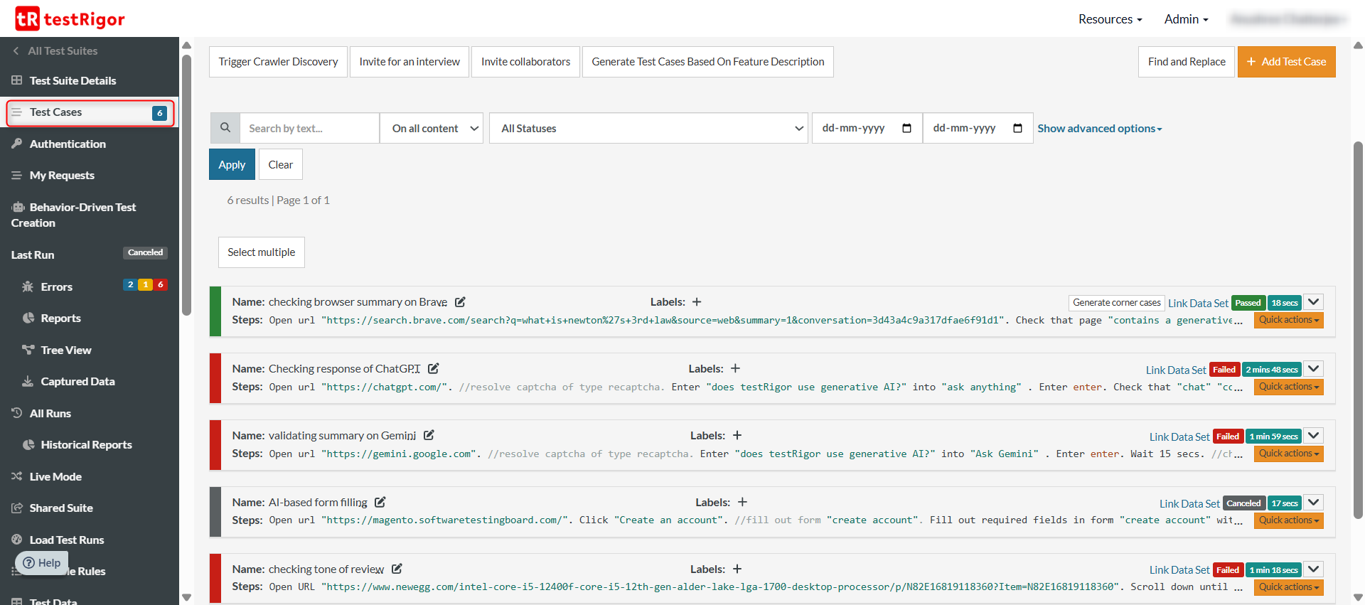 1. See individual, step-by-step test runs for every test case