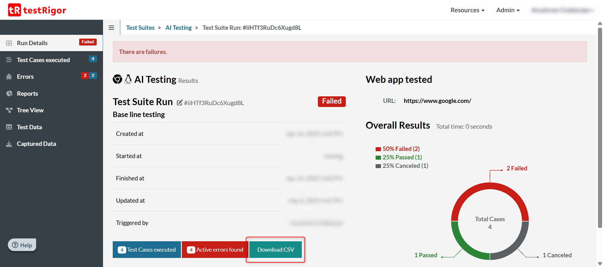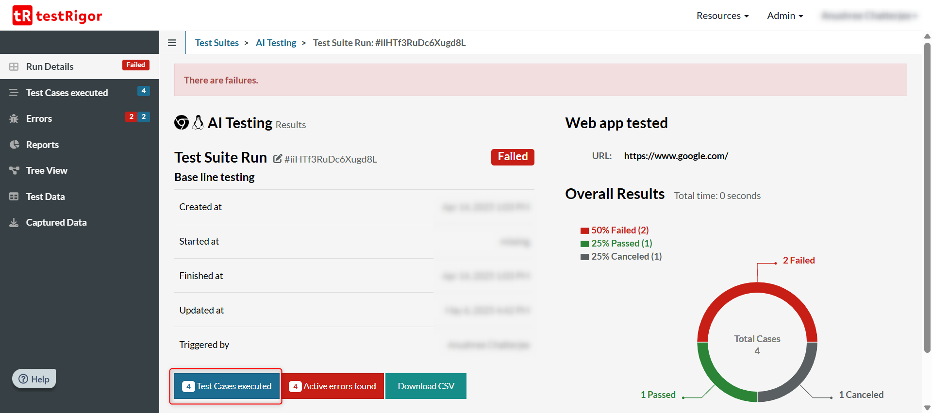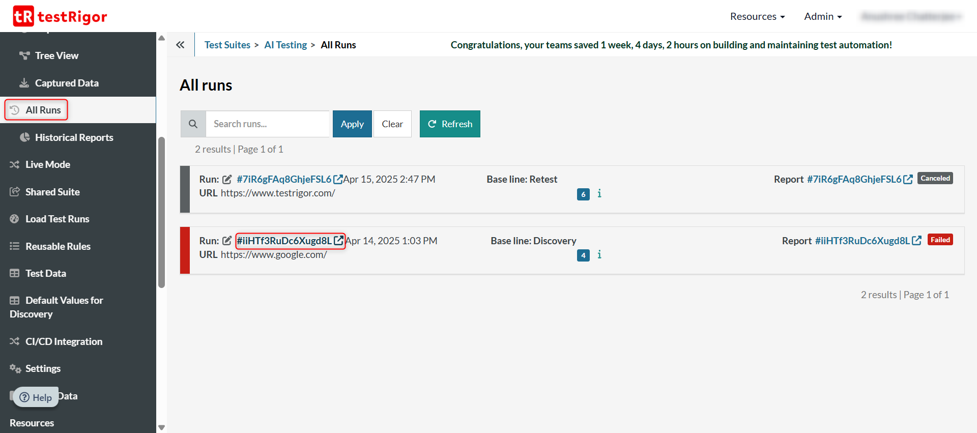You can view these 21 CFR Part 11 compliant test results from a couple of places within testRigor.