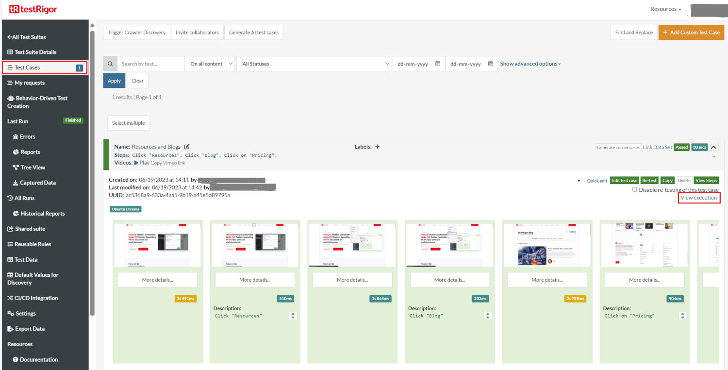 To view the execution results, navigate to the Test Cases tab and click on View execution.
