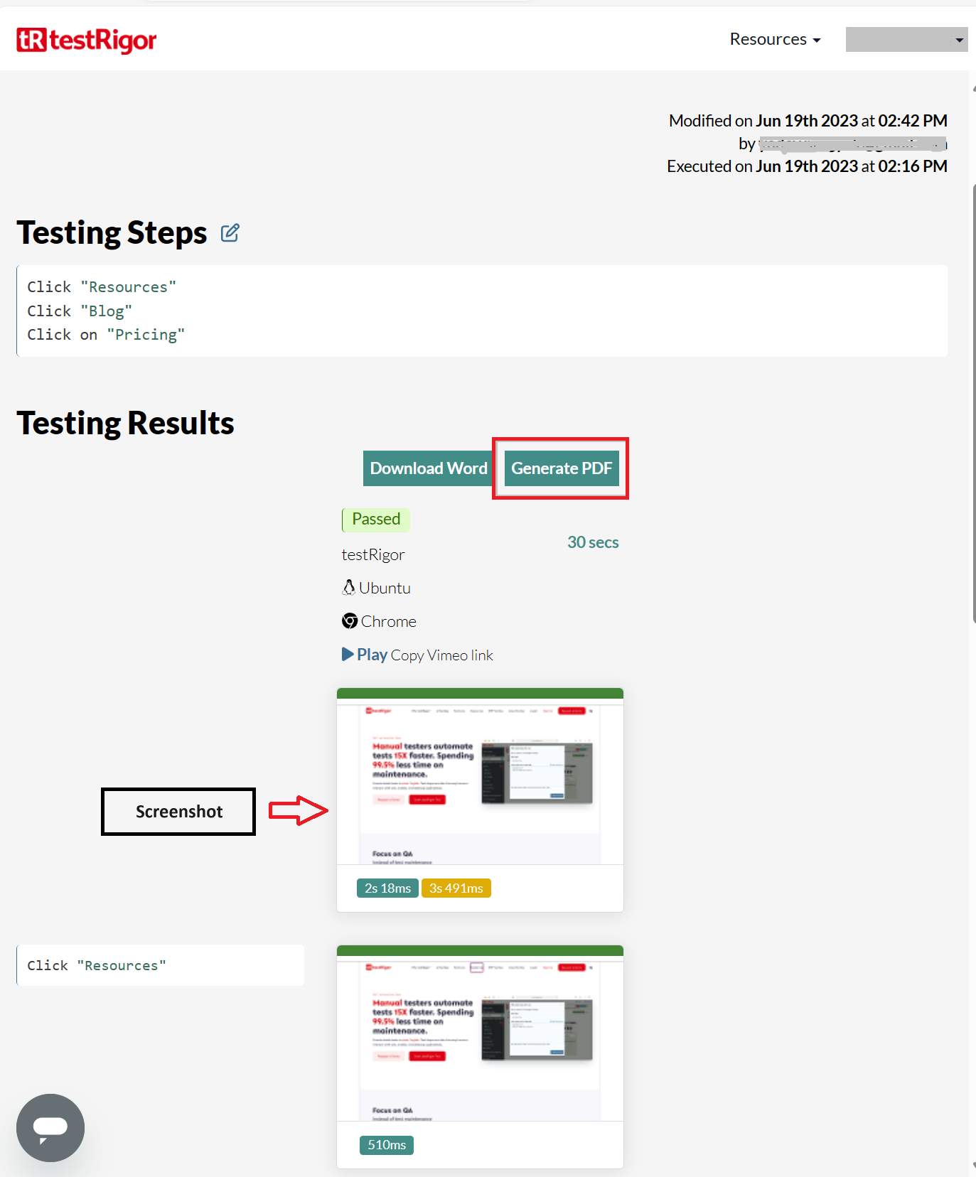 In the execution results, you can ‘Generate PDF‘ or ‘Download Word‘ files with screenshots.