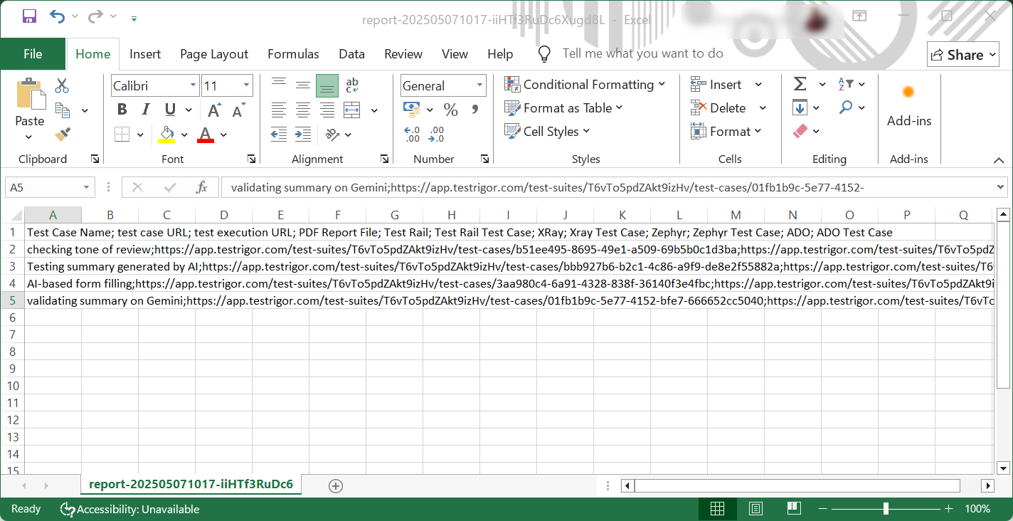 You can export the test suite details, including the test cases and their runs in the suite, along with their URLs.