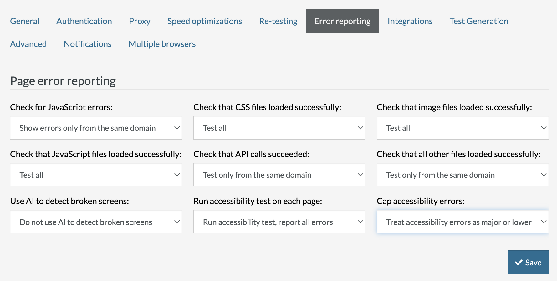 testRigor supports accessibility testing out of the box. The way it works is as follows: you can turn on “Run accessibility test on each page:” Setting on “Error Reporting” tab in Settings: