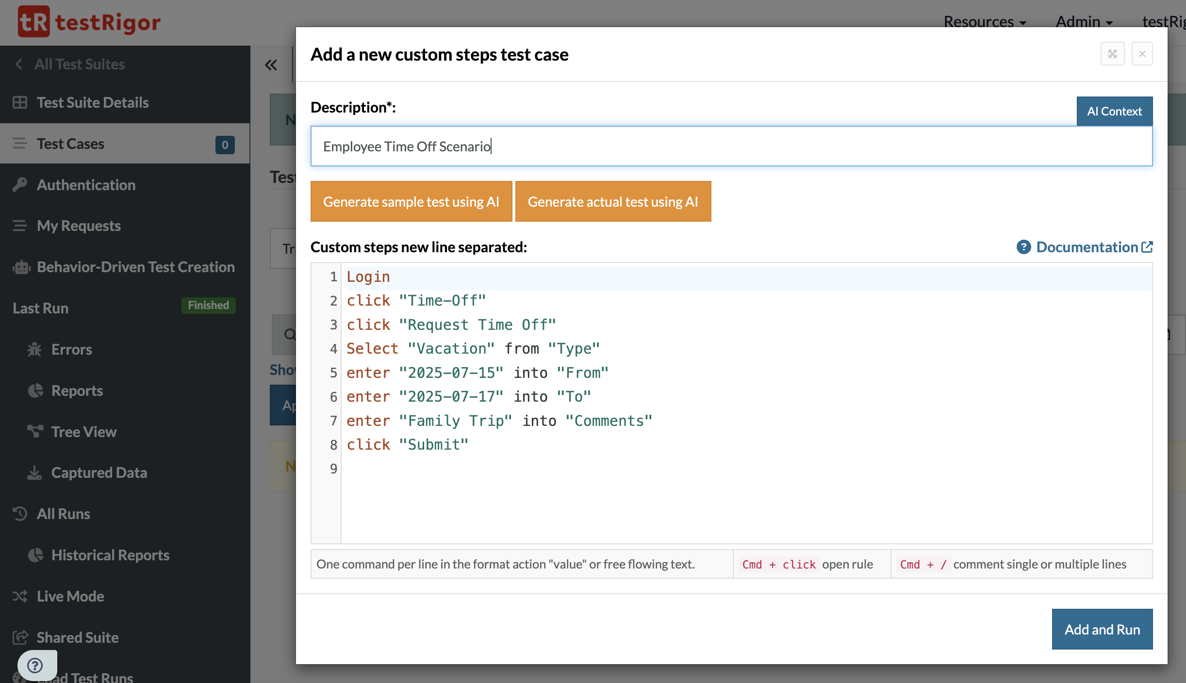 - AI Test Generation: Utilizing generative AI, testRigor facilitates the automatic creation of test scripts. The person only needs to provide the app/requirement or feature description. Read: All-Inclusive Guide to Test Case Creation in testRigor.