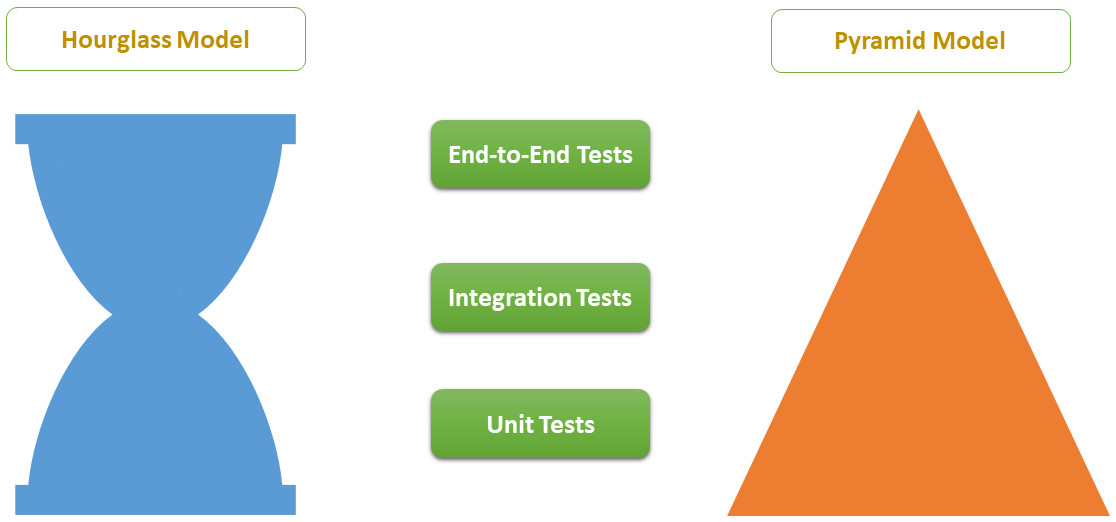 - Top of the Hourglass: Contrary to the pyramid, End-to-End tests are equally important and in volume as unit tests.