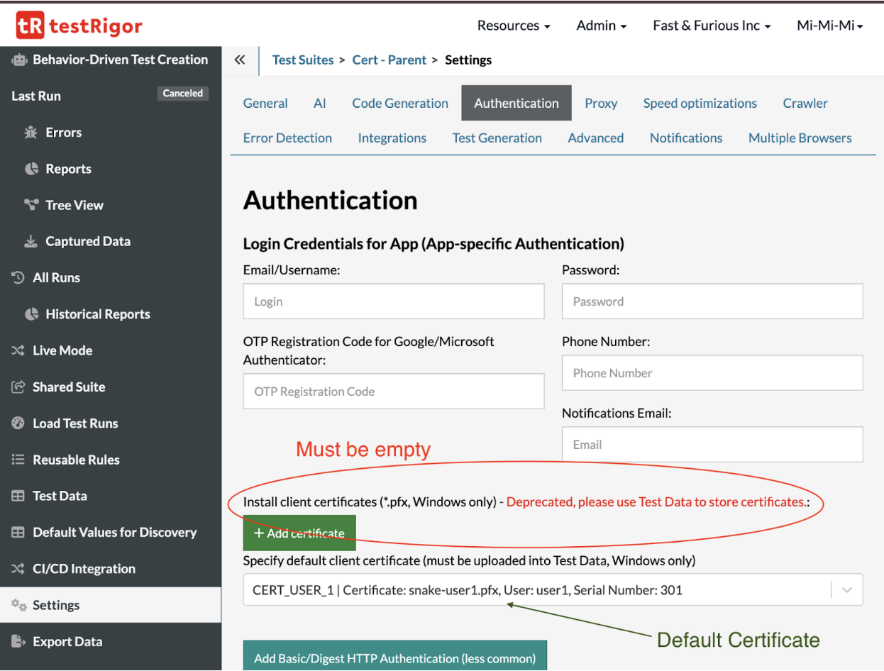 - If most of your test cases use the same certificate, you can select a default certificate in the settings.