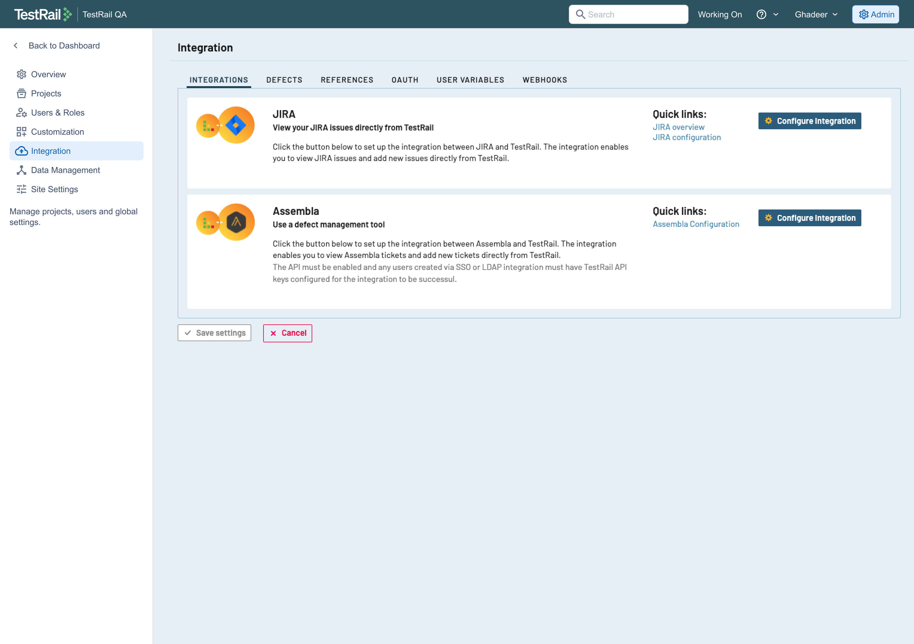 First, you need to allow TestRail integration on by navigating to Settings > Integrations.